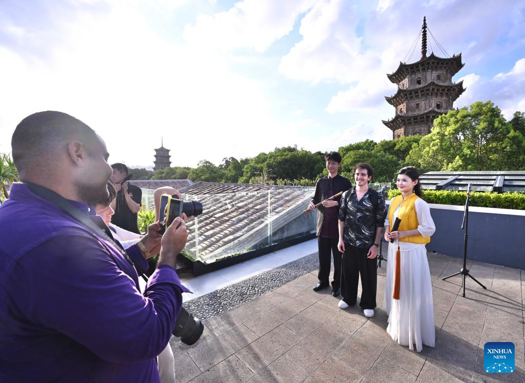 A foreign tourist (C) takes a photo with artists of Quanzhou Nanyin at the West Street scenic spot in Quanzhou, southeast China's Fujian Province, on June 20, 2025. Quanzhou City on Friday issued a guide to Quanzhou for expats and a travel guide for 240-hour visa-free transit in the city.