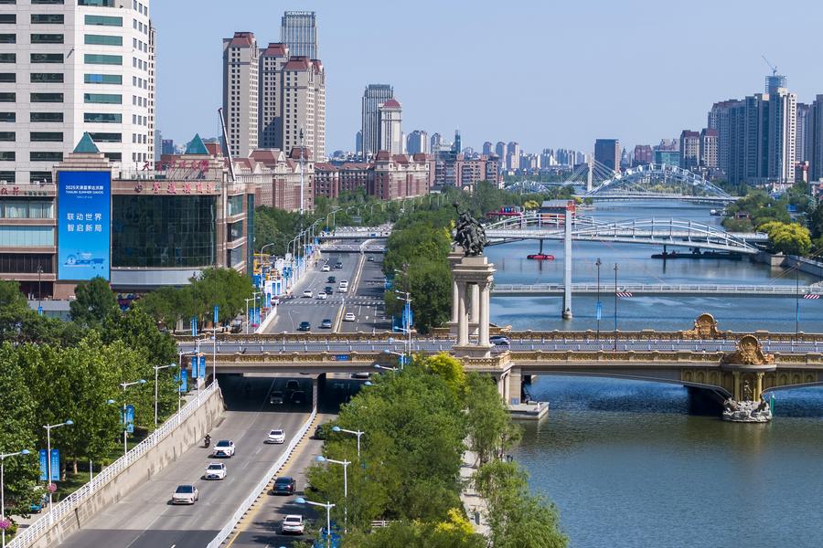 An aerial drone photo taken on June 21, 2025 shows a poster of the 2025 Summer Davos hung on a building along the Haihe River in Tianjin Municipality, north China. (Xinhua/Zhao Zishuo)