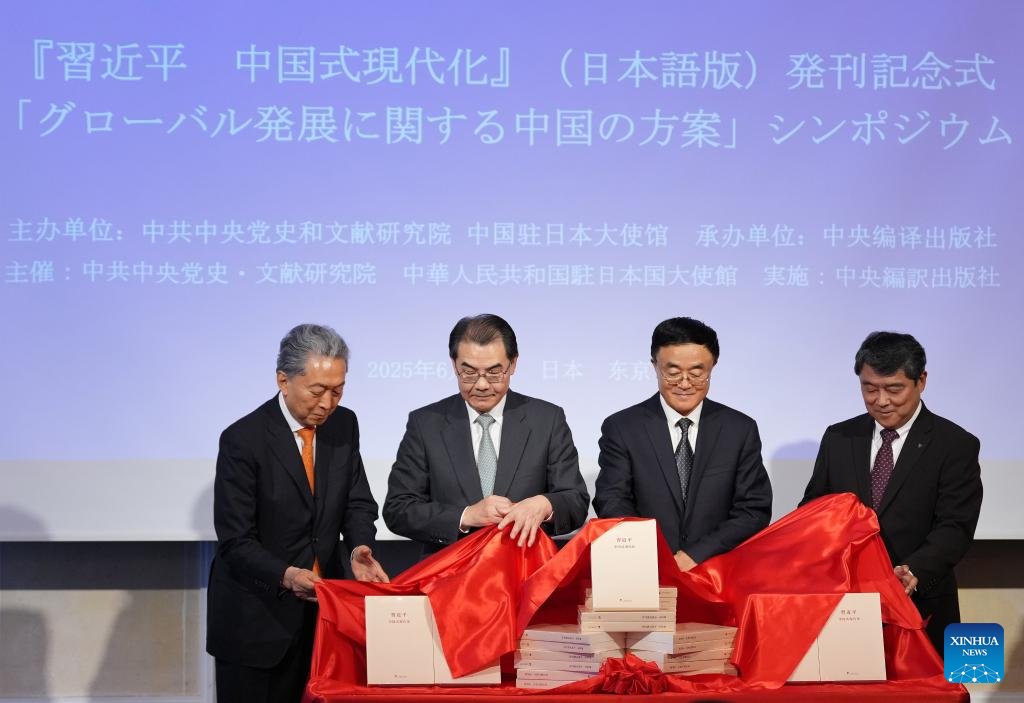 Guests unveil the Japanese version of a compilation of excerpts from discourses on Chinese modernization by Chinese President Xi Jinping during the launch ceremony in Tokyo, Japan, June 19, 2025. The launch ceremony for the Japanese version of a compilation of excerpts from discourses on Chinese modernization by Chinese President Xi Jinping and a seminar on Chinese solutions to global development has been held in Tokyo. (Xinhua/Jia Haocheng)