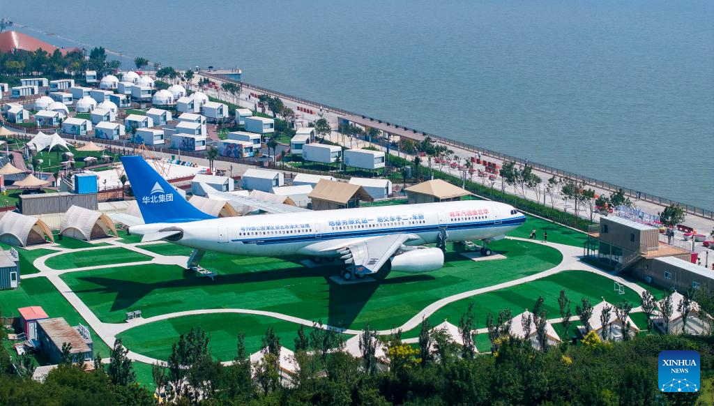 A drone photo taken on June 21, 2025 shows a camping base at a seaside park in Binhai New Area in north China's Tianjin. In recent years, Binhai New Area in Tianjin has made great efforts to protect ecological environment and upgraded the layout of parks. Several seaside landmarks in Binhai have become popular tourist destinations. (Xinhua/Zhao Zishuo)