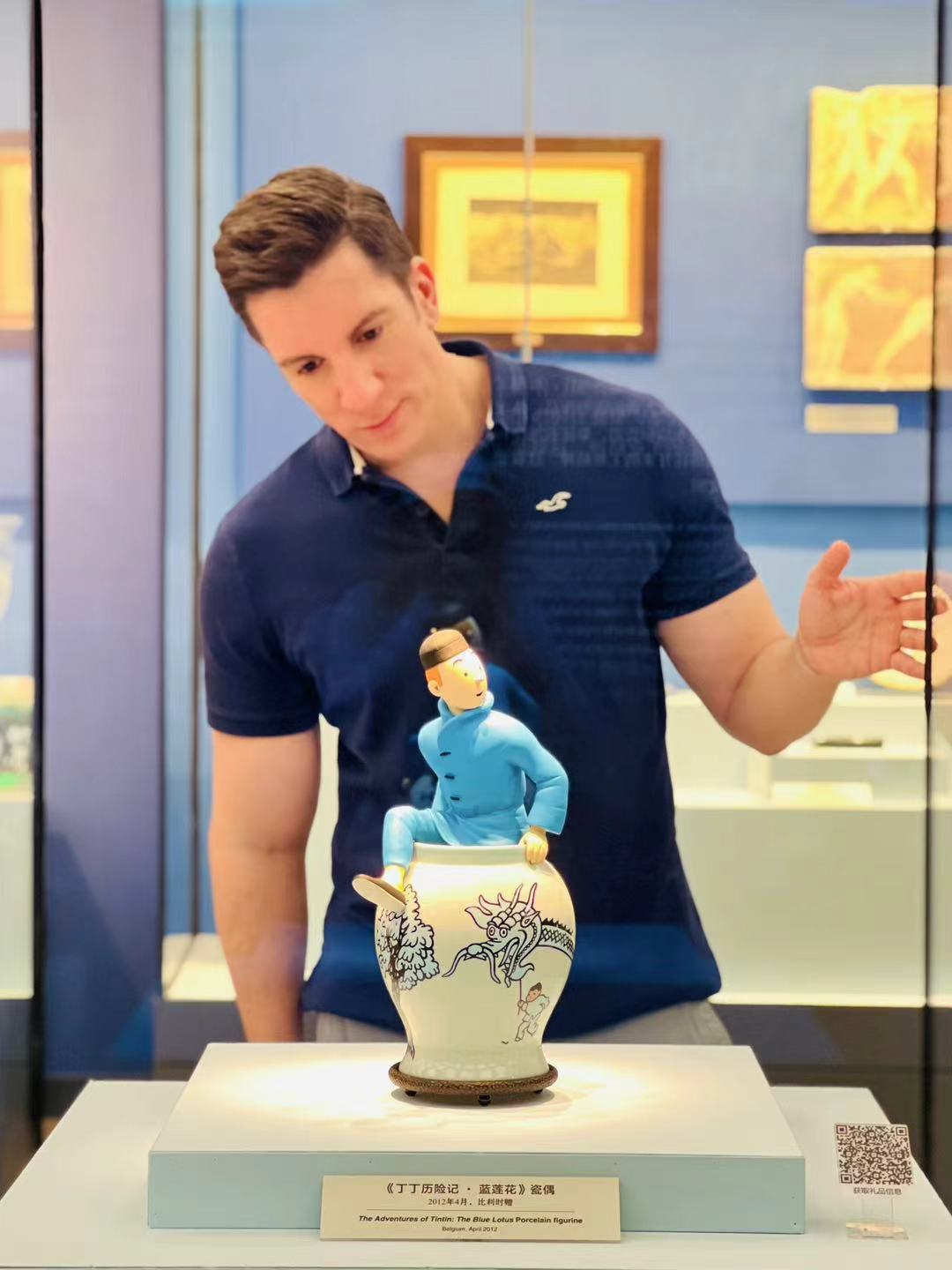 China received this Tintin porcelain figurine in 2012 as a gift from Belgium. The porcelain Tintin wears traditional Chinese clothing, standing on a vase imprinted with the image of a Chinese dragon. In 1934, Hergé met Zhang Chongren, a Chinese student studying in Europe and developed "The Adventures of Tintin: The Blue Lotus" with the help of Zhang, presenting an objective view of China's history and culture to western audiences.