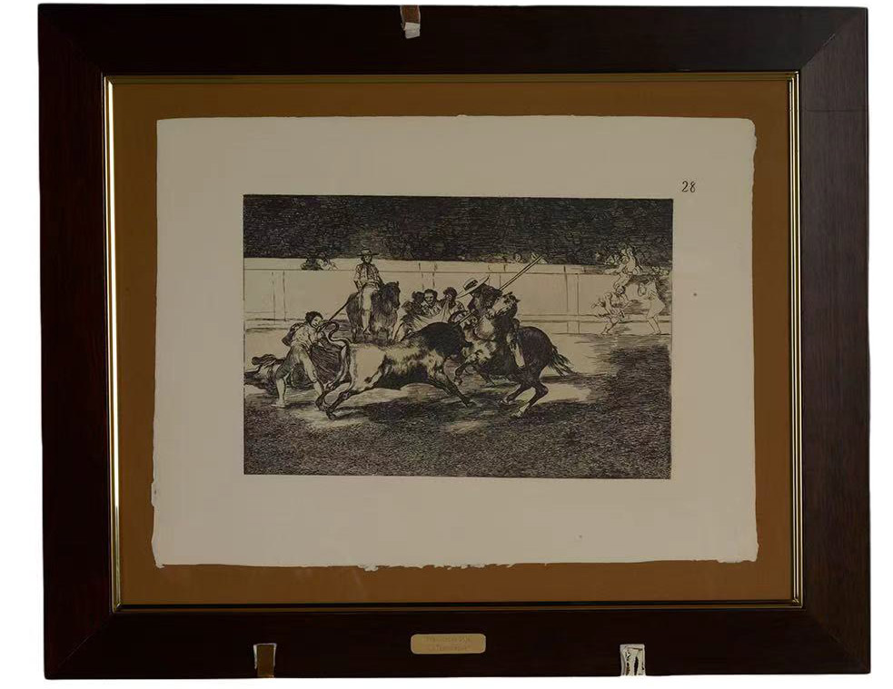 This is a black and white print presented by Spain to China in 1985, showing traditional Spanish bullfighting. From San Jose Day on March 19 to Spanish National Day on October 12, the bullfighting season lasts for seven months. (Central Gifts and Cultural Relics Management Center)