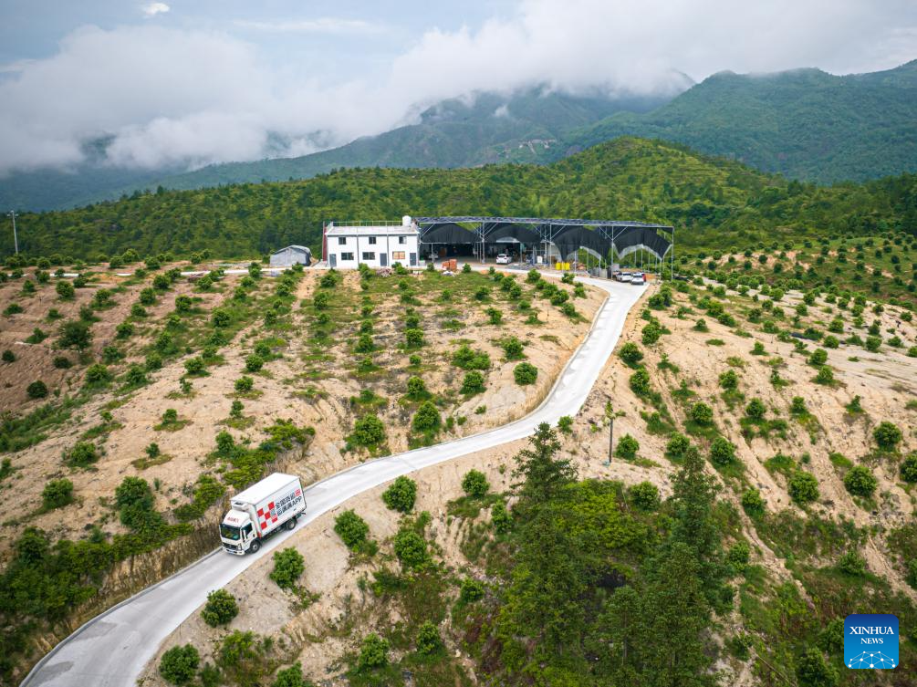 An aerial drone photo shows a cold-chain lorry loaded with Dongkui waxberries driving out of an orchard in Wencheng County, east China's Zhejiang Province, June 23, 2025.