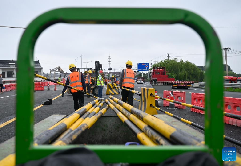 Workers reset road dividers for the left lanes of the newly-built Pingwang Bridge in Wujiang District of Suzhou City, east China's Jiangsu Province on June 23, 2025.