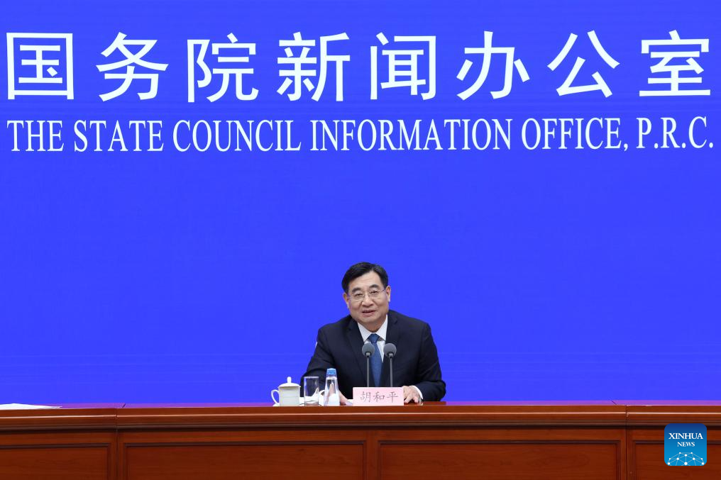 Hu Heping, executive vice minister of the Publicity Department of the Communist Party of China Central Committee, speaks at a press conference held by China's State Council Information Office on plans for marking the 80th anniversary of the victory in the Chinese People's War of Resistance Against Japanese Aggression and the World Anti-Fascist War, in Beijing, capital of China, June 24, 2025. Hu and Major General Wu Zeke (not in the picture), deputy director of the Leading Group Office of Military Parade and deputy director general of the Operation Bureau of the Joint Staff Department of the Central Military Commission, briefed the media on the arrangement of commemorative activities and took questions. (Xinhua/Jin Liwang)