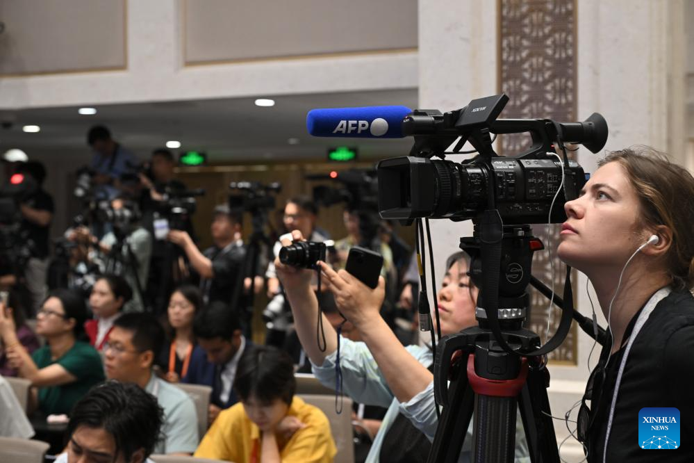Journalists work at a press conference held by China's State Council Information Office on plans for marking the 80th anniversary of the victory in the Chinese People's War of Resistance Against Japanese Aggression and the World Anti-Fascist War, in Beijing, capital of China, June 24, 2025. Hu Heping, executive vice minister of the Publicity Department of the Communist Party of China Central Committee, and Major General Wu Zeke, deputy director of the Leading Group Office of Military Parade and deputy director general of the Operation Bureau of the Joint Staff Department of the Central Military Commission, briefed the media on the arrangement of commemorative activities and took questions. (Xinhua/Jin Liangkuai)