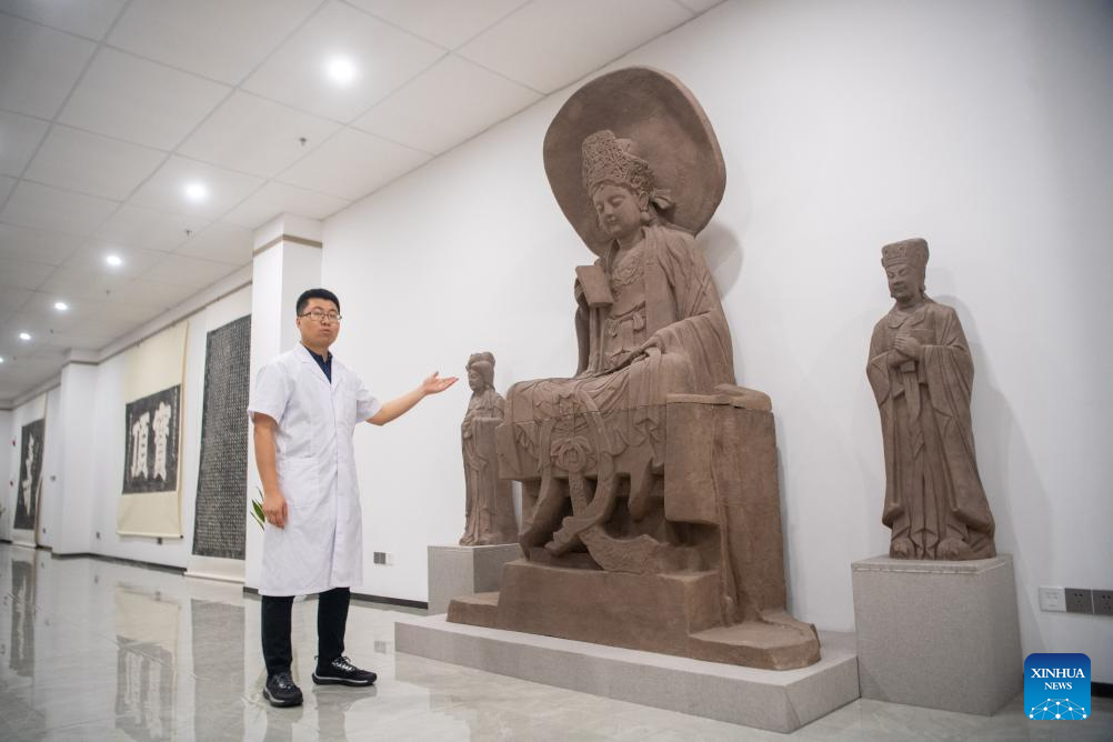 A staff member introduces a relic restored with 3D digital technology at the Dazu Rock Carvings studio for relics restoration in southwest China's Chongqing Municipality, June 24, 2025. Dazu Rock Carvings, a UNESCO World Heritage Site in southwest China's Chongqing Municipality, is being injected with new vigor as various digital technologies are used for its protection and utilization.