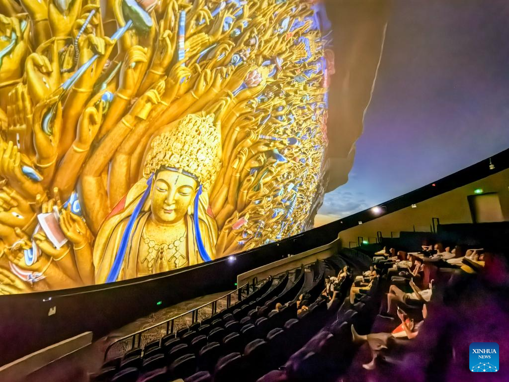 People watch an 8K dome theater movie at the Dazu Rock Carvings scenic spot in southwest China's Chongqing Municipality, June 24, 2025. Dazu Rock Carvings, a UNESCO World Heritage Site in southwest China's Chongqing Municipality, is being injected with new vigor as various digital technologies are used for its protection and utilization.