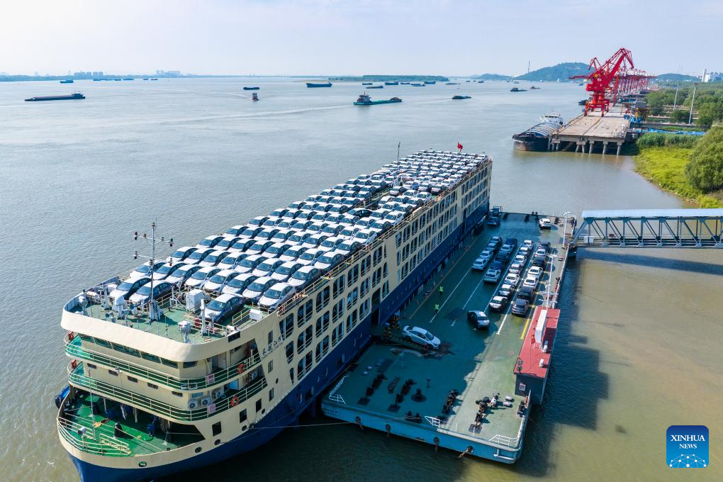 Staff members load cars for export into a carriage of a special-purpose train at the Paihe Port railway logistics base in Hefei, east China's Anhui Province, June 17, 2025. Anhui Province takes advantage of convenient transportation infrastructure such as railway freight stations and ports along the Yangtze River to vigorously promote logistics development and local consumption. (Xinhua/Zhou Mu)