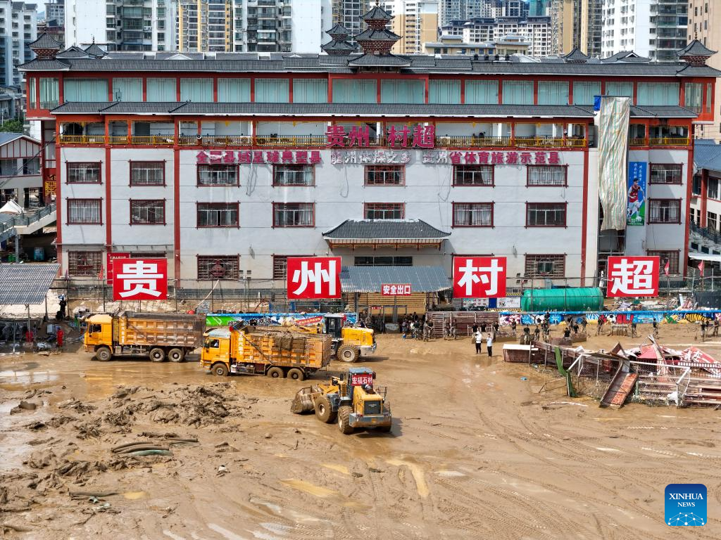 People clear silt on the road in Congjiang County, southwest China's Guizhou Province, June 25, 2025. Continuous heavy rainfall and upstream inflows have triggered severe flooding in two counties of Guizhou Province in southwest China, prompting mass evacuations.
