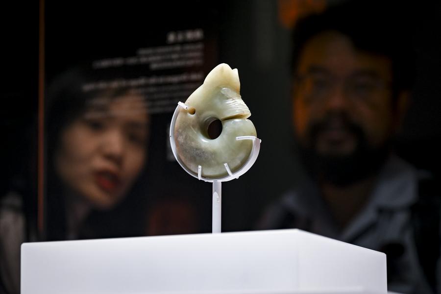 Visitors appreciate an exhibit during a media preview of the exhibition titled "Legends of Dragon: The Ancient Civilization of Hongshan Culture" at the Shanghai Museum East in east China's Shanghai, June 25, 2025. (Photo by Chen Haoming/Xinhua)