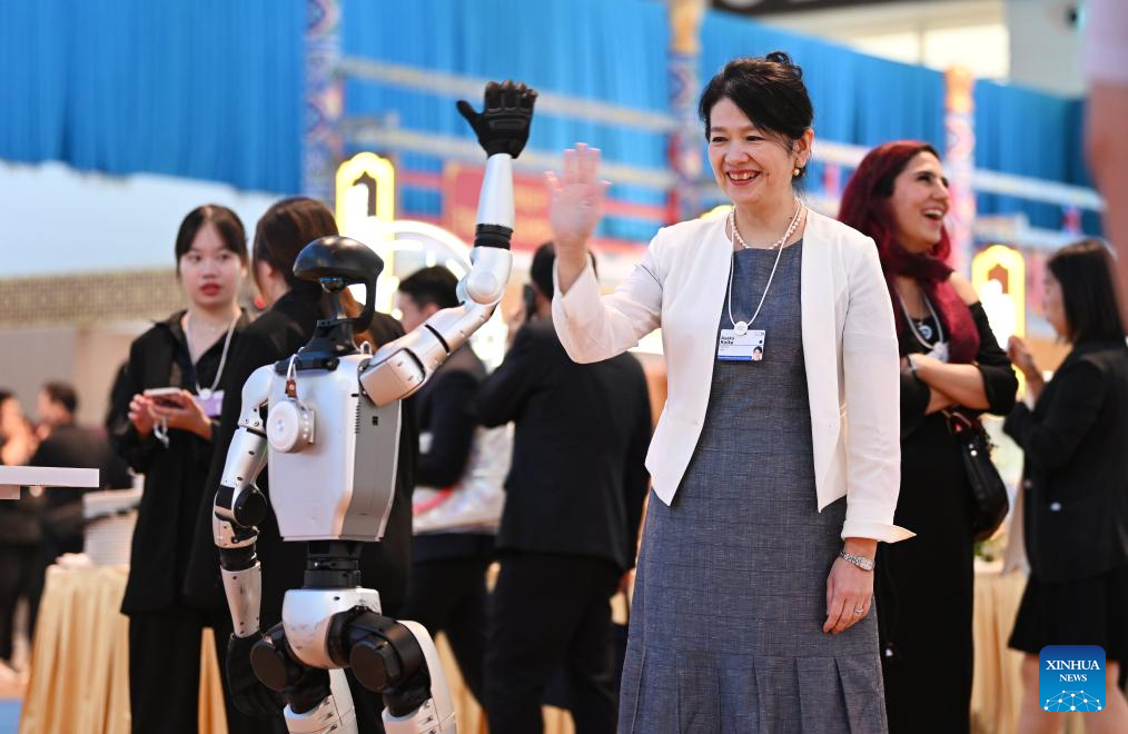 A guest interacts with a robot during the Cultural Soiree of the 16th Annual Meeting of the New Champions, also known as the Summer Davos, in north China's Tianjin Municipality, June 25, 2025. Attendees learned about traditional Chinese culture, tasted characteristic food of Tianjin and enjoyed performances at the event. (Xinhua/Li Ran)