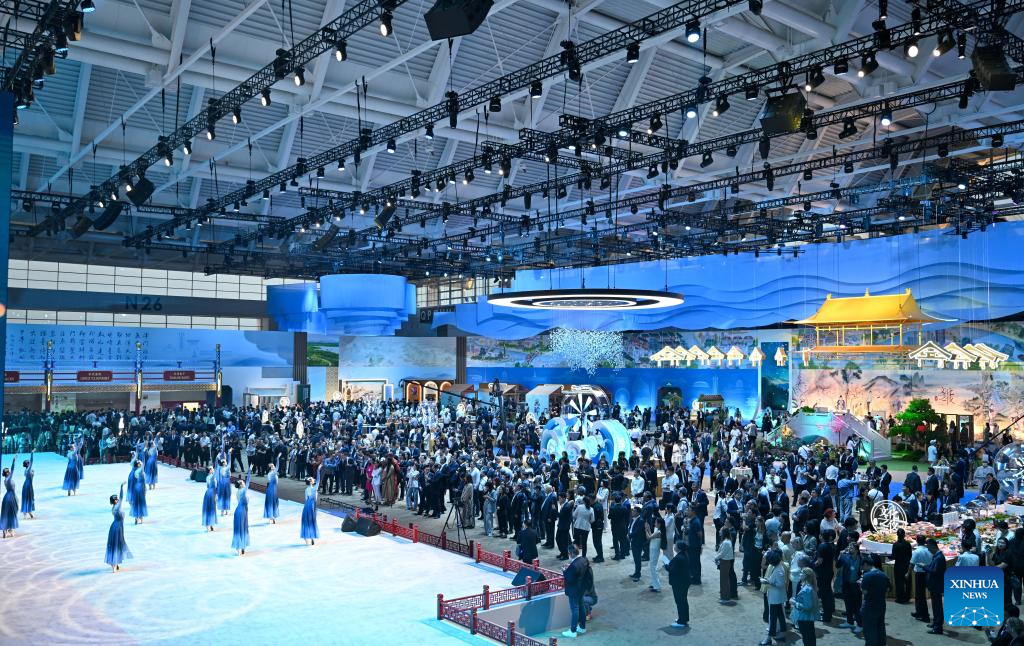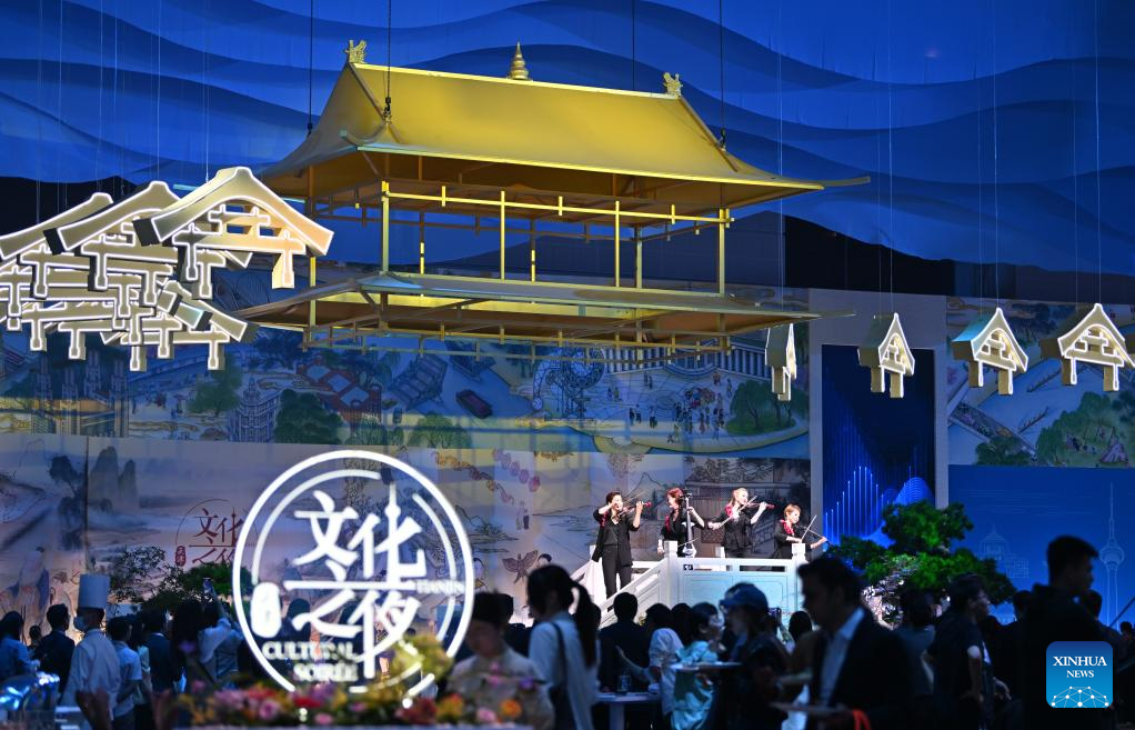 This photo taken on June 25, 2025 shows a view of the Cultural Soiree of the 16th Annual Meeting of the New Champions, also known as the Summer Davos, in north China's Tianjin Municipality. Attendees learned about traditional Chinese culture, tasted characteristic food of Tianjin and enjoyed performances at the event. (Xinhua/Sun Fanyue)