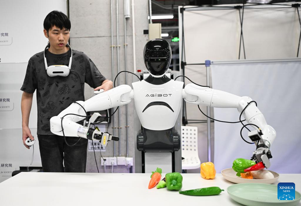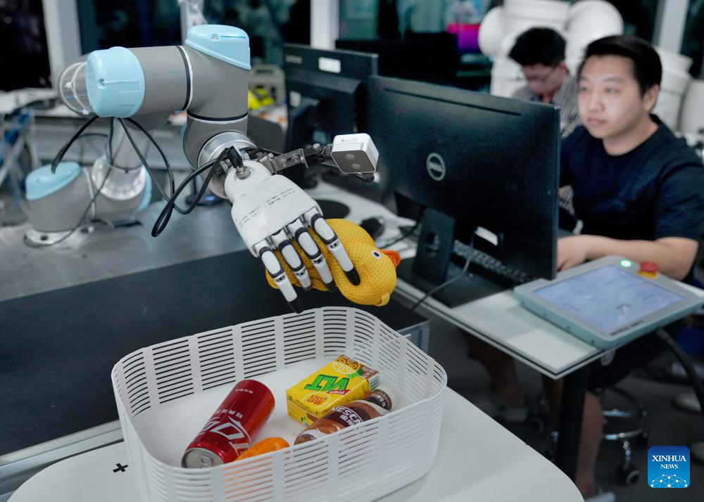 A staff member operates robot to grab items at a provincial embodied artificial intelligence robot innovation center in Shenzhen, south China's Guangdong Province, June 25, 2025. In recent years, Guangdong Province has taken various measures to develop the robot industry. The application and promotion of embodied artificial intelligence robots has been gaining speed in Guangzhou and Shenzhen, and a provincial embodied artificial intelligence robot innovation center was established in Shenzhen. In addition, cities like Foshan, Dongguan and Zhuhai are encouraged to give full play to their manufacturing advantages to build robot production bases.