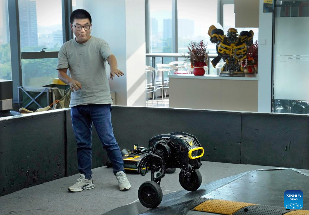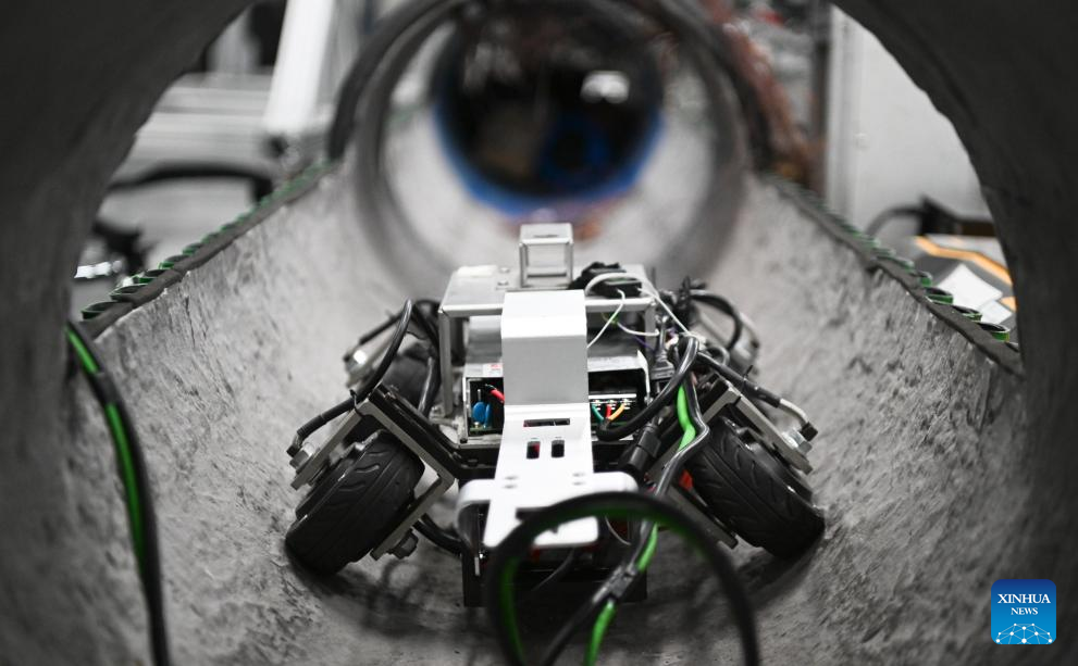 A pipeline inspection robot is pictured at a provincial embodied artificial intelligence robot innovation center in Shenzhen, south China's Guangdong Province, June 25, 2025. In recent years, Guangdong Province has taken various measures to develop the robot industry. The application and promotion of embodied artificial intelligence robots has been gaining speed in Guangzhou and Shenzhen, and a provincial embodied artificial intelligence robot innovation center was established in Shenzhen. In addition, cities like Foshan, Dongguan and Zhuhai are encouraged to give full play to their manufacturing advantages to build robot production bases.