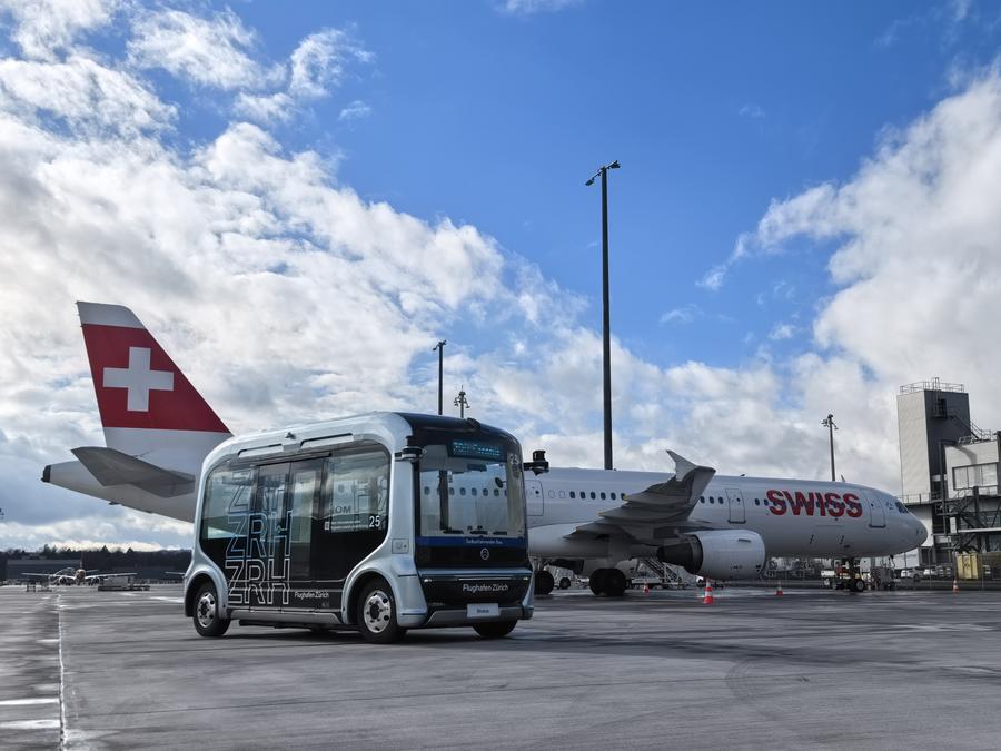 This photo taken on April 17, 2025 shows a WeRide Robobus (front) operating at an airport in Zurich, Switzerland. (Xinhua)