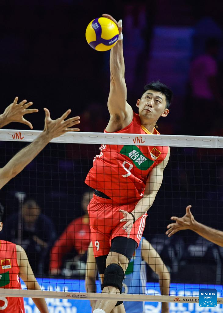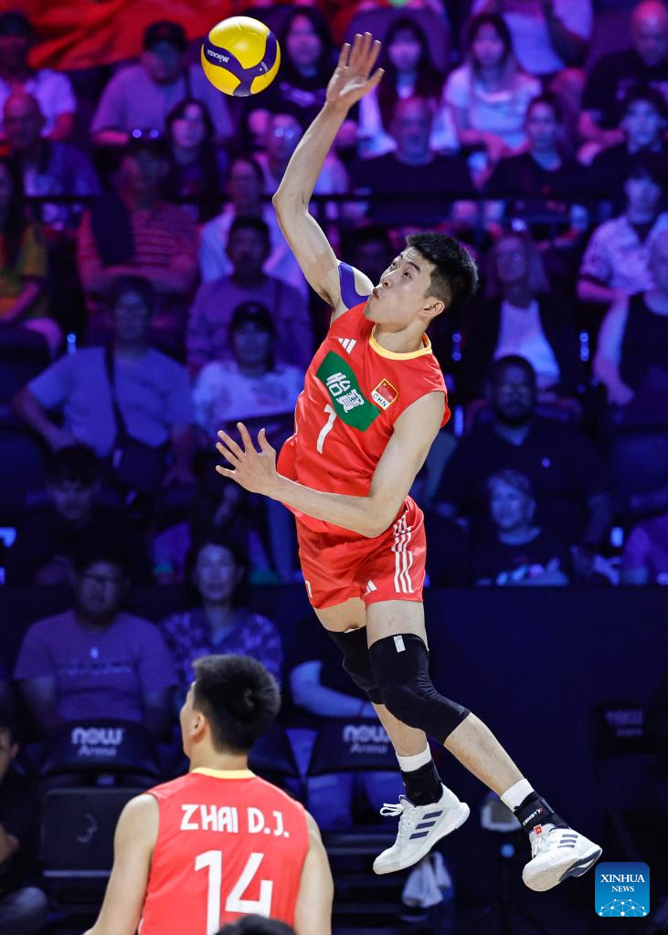 Li Yongzhen of China spikes the ball during the Pool 5 match between China and Brazil at the Men's Volleyball Nations League (VNL) 2025 in Chicago, the United States, June 26, 2025. (Photo by Joel Lerner/Xinhua)