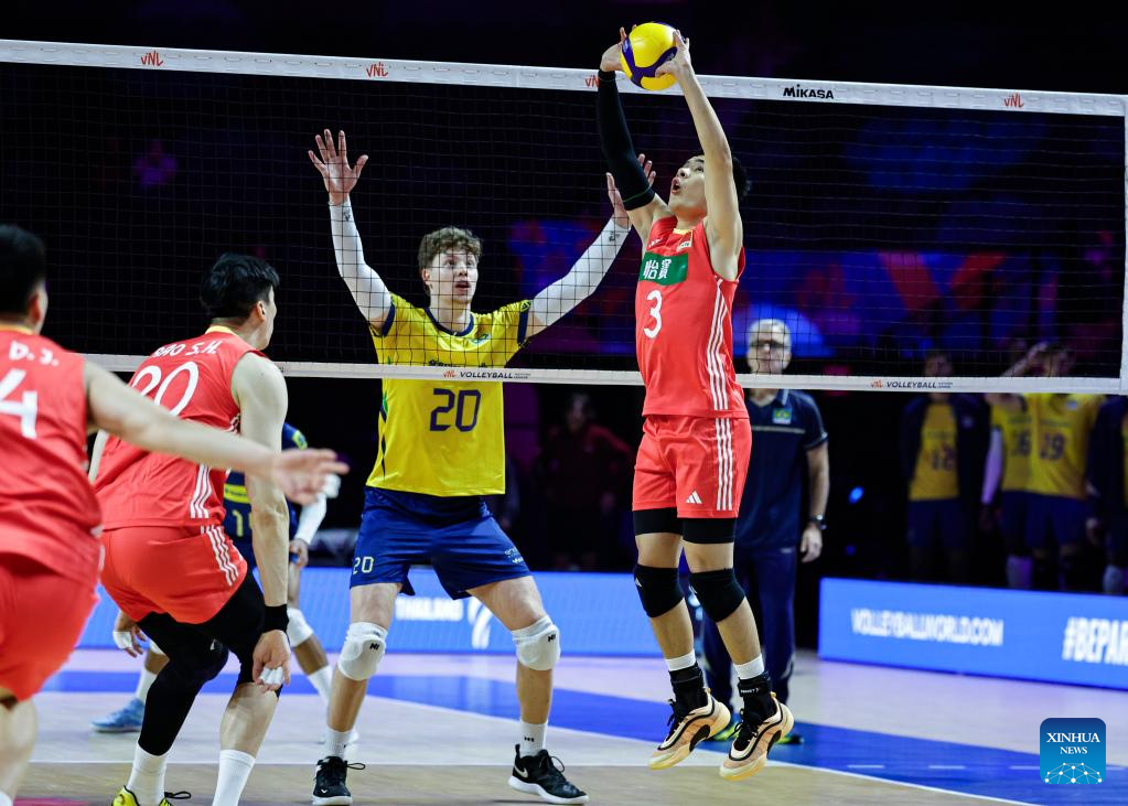 Li Yongzhen (top R) of China spikes the ball during the Pool 5 match between China and Brazil at the Men's Volleyball Nations League (VNL) 2025 in Chicago, the United States, June 26, 2025. (Photo by Joel Lerner/Xinhua)