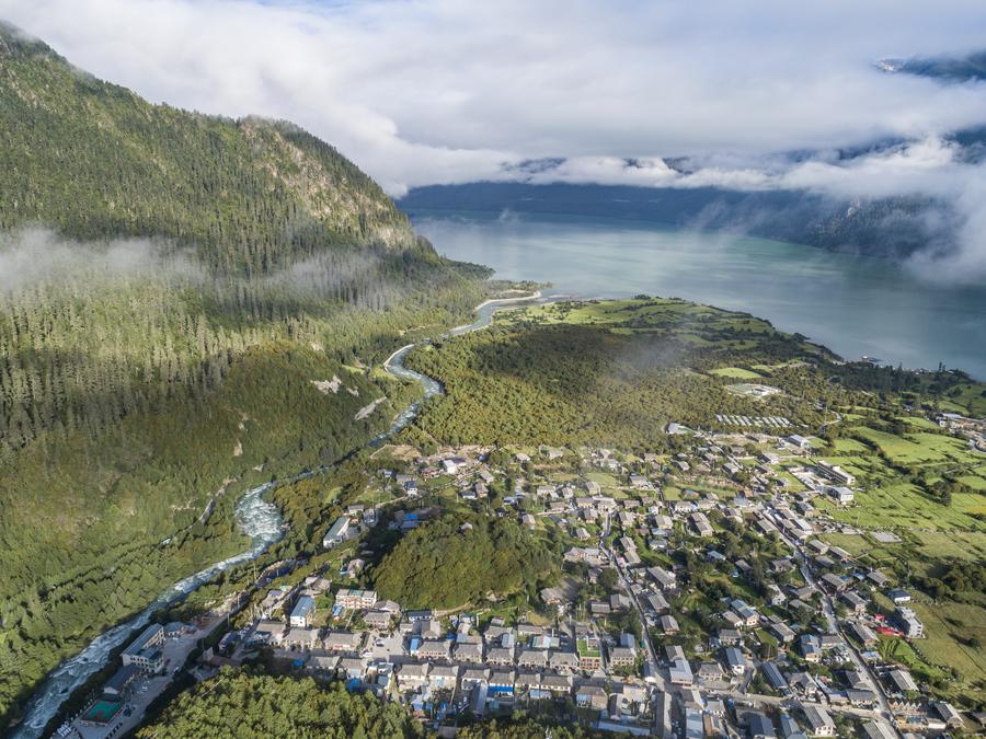 This aerial photo taken on July 20, 2023 shows a view of the Gaiba Village of Gongbo'Gyamda County in Nyingchi City, southwest China's Xizang Autonomous Region. (Xinhua/Sun Fei)