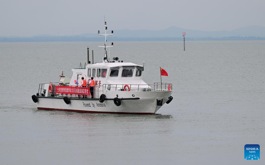 This photo taken on June 28, 2025 shows the pure ammonia-powered demonstration vessel, the "Anhui," making its maiden voyage at the water area of Chaohu Lake in Hefei, east China's Anhui Province. (Xinhua/Zhou Mu)