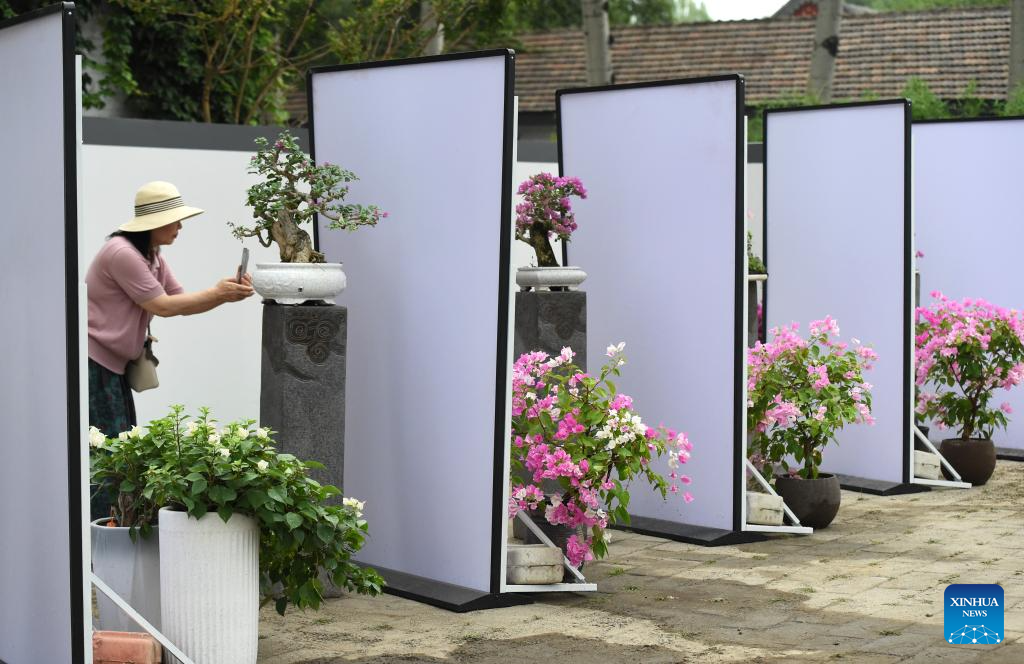A tourist takes photos of flowers at a flower exhibition during a lotus festival at Yuanmingyuan Park in Beijing, capital of China, June 28, 2025. A lotus festival kicked off in Yuanmingyuan Park on Saturday and will run until Aug. 31. (Xinhua/Luo Xiaoguang)