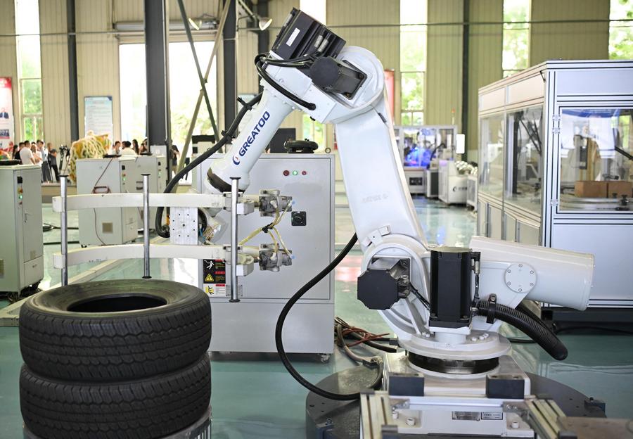 This photo taken on June 29, 2025 shows an automated tire transporting robot at Greatoo Intelligent in Jieyang, south China's Guangdong Province. (Xinhua/Deng Hua)