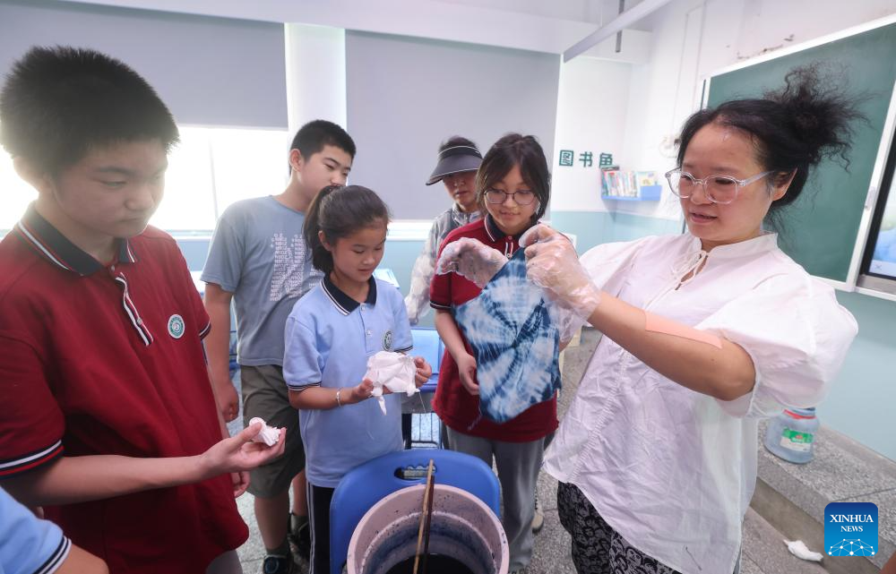 A volunteer teaches children to tie-dye at the Donghe Township central school in Donghe Township, Zhuji City of east China's Zhejiang Province, July 1, 2025. Summer camps themed on cultural promotion have been launched here, to enrich summer vocation activities for local students. (Xinhua/Xu Yu)