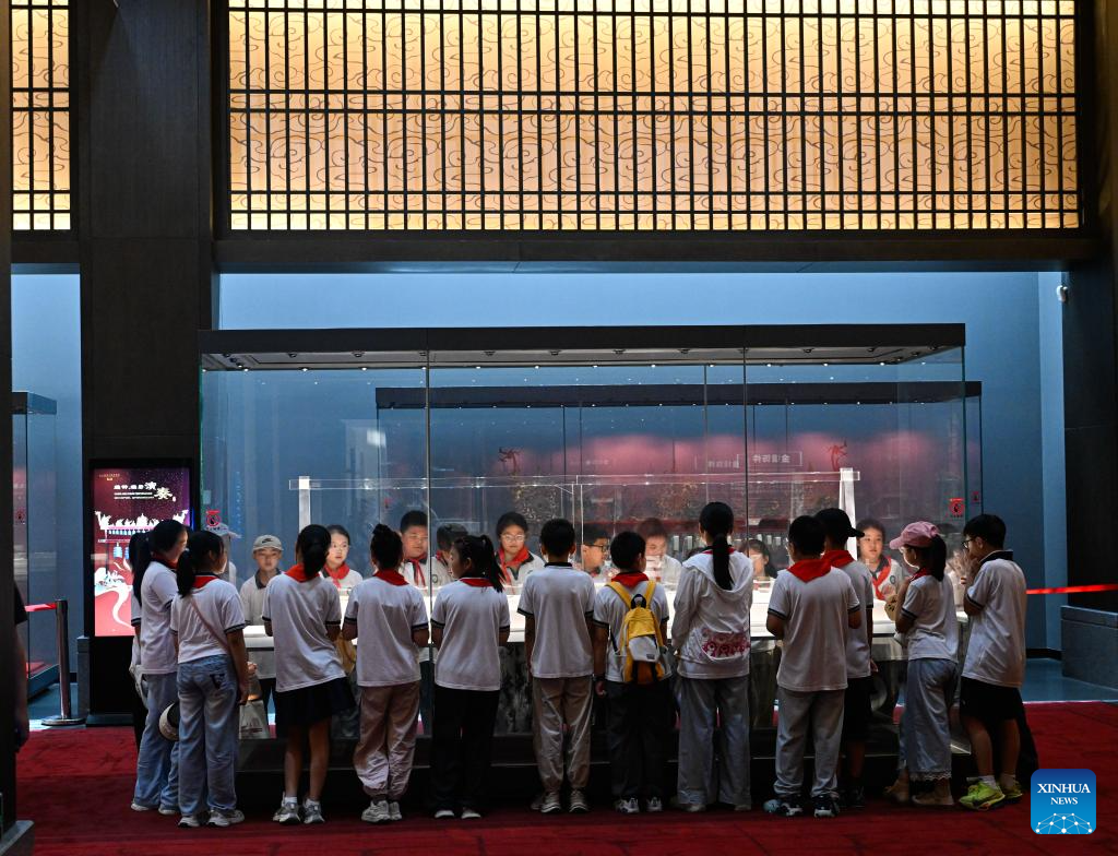 Students visit a museum featuring Han Dynasty (202 BC-220 AD) tombs to spend their summer time in Xuyi, east China's Jiangsu Province, July 2, 2025. The museum of Han king's mausoleum at Dayun Mountain in Xuyi stages several featured exhibitions in this summer holiday to attract people to visit and learn about history knowledge. (Xinhua/Ji Chunpeng)