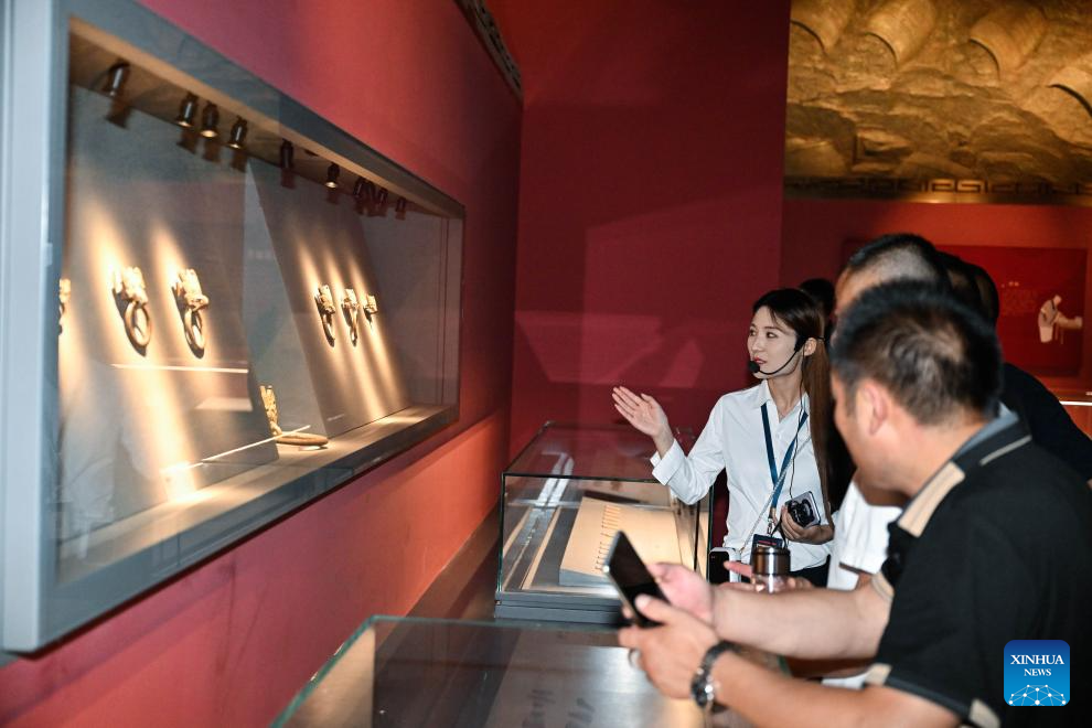 A tour guide introduces cultural relics to visitors at a museum featuring Han Dynasty (202 BC-220 AD) tombs in Xuyi, east China's Jiangsu Province, July 2, 2025. The museum of Han king's mausoleum at Dayun Mountain in Xuyi stages several featured exhibitions in this summer holiday to attract people to visit and learn about history knowledge. (Xinhua/Ji Chunpeng)