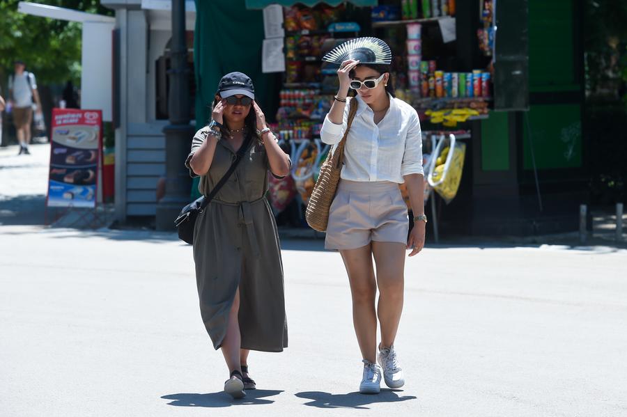 People walk on a street during a heat wave in Madrid, Spain, May 29, 2025. (Photo by Gustavo Valiente/Xinhua)