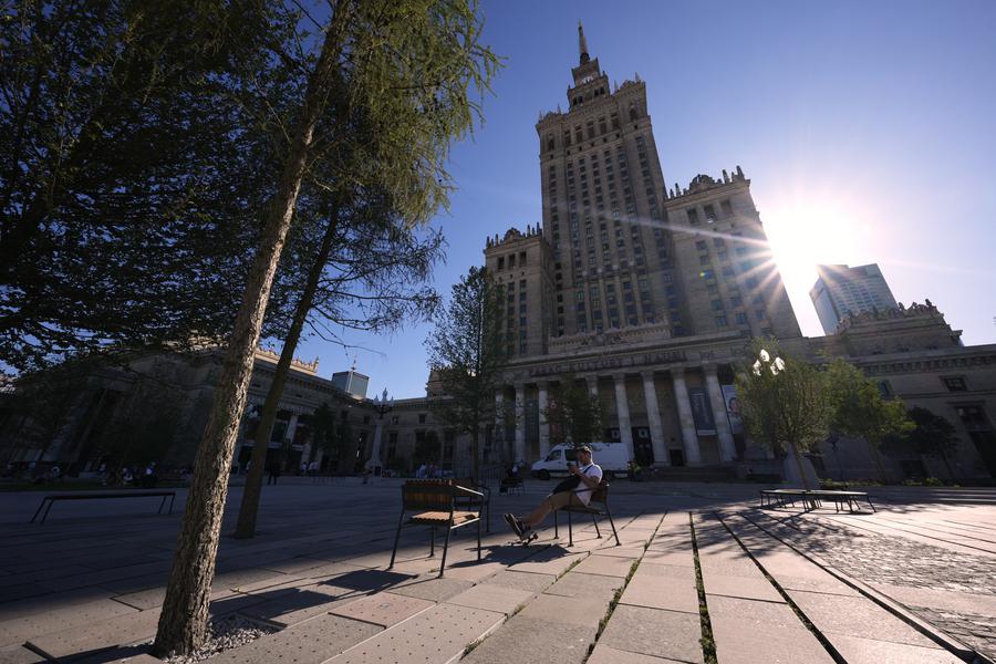 A man sits at a square next to the Palace of Culture and Science in Warsaw, Poland, on July 1, 2025. Poland's meteorological authorities have issued heat warnings for much of the country this week. (Photo by Jaap Arriens/Xinhua)