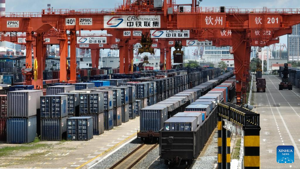 A drone photo taken on July 3, 2025 shows gantry cranes loading containers onto a freight train in Qinzhou railway container center station in south China's Guangxi Zhuang Autonomous Region. Cargo volume on the New International Land-Sea Trade Corridor surged 76.9 percent year on year to 746,000 twenty-foot equivalent units (TEUs) in the first six months of this year, according to the China Railway Nanning Group. The corridor now operates 14 fixed train routes connecting Beibu Gulf Port in Guangxi and Zhanjiang Port in neighboring Guangdong Province to major inland hubs including Chongqing, Chengdu, Guiyang, Lanzhou, Huaihua and Xi'an. Goods transported through the trade corridor via intermodal rail-sea service now cover 1,236 categories, 79 more than a year earlier, spanning electronics, vehicles and auto parts, machinery, household appliances, and food. (Xinhua/Zhang Ailin)