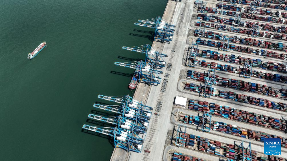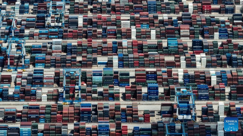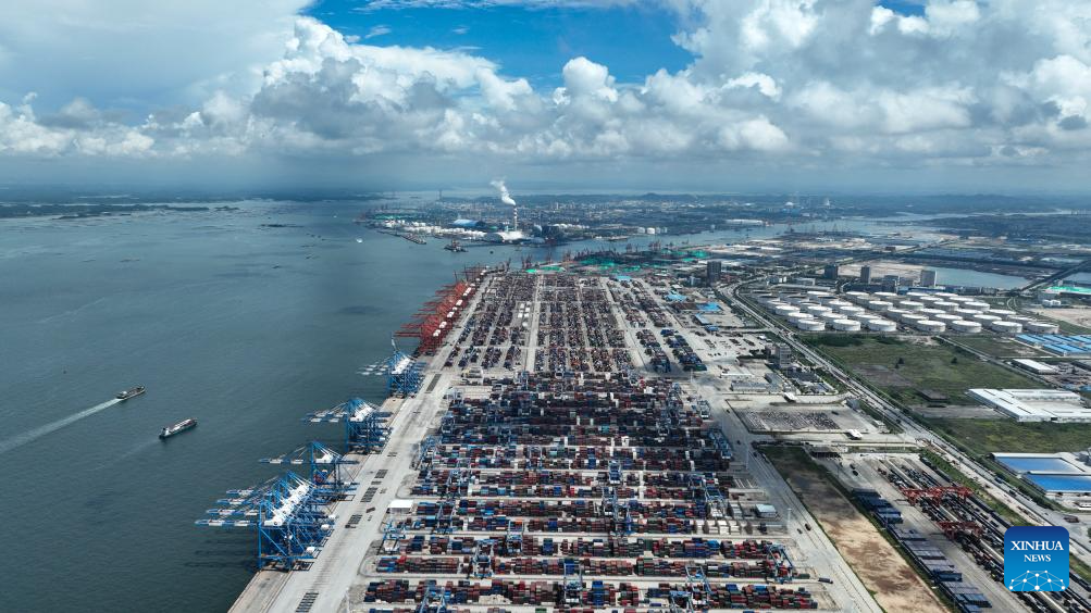 An aerial drone photo taken on July 3, 2025 shows a container yard of an automated container terminal of Qinzhou Port in Qinzhou City, south China's Guangxi Zhuang Autonomous Region. Cargo volume on the New International Land-Sea Trade Corridor surged 76.9 percent year on year to 746,000 twenty-foot equivalent units (TEUs) in the first six months of this year, according to the China Railway Nanning Group. The corridor now operates 14 fixed train routes connecting Beibu Gulf Port in Guangxi and Zhanjiang Port in neighboring Guangdong Province to major inland hubs including Chongqing, Chengdu, Guiyang, Lanzhou, Huaihua and Xi'an. Goods transported through the trade corridor via intermodal rail-sea service now cover 1,236 categories, 79 more than a year earlier, spanning electronics, vehicles and auto parts, machinery, household appliances, and food. (Xinhua/Zhang Ailin)