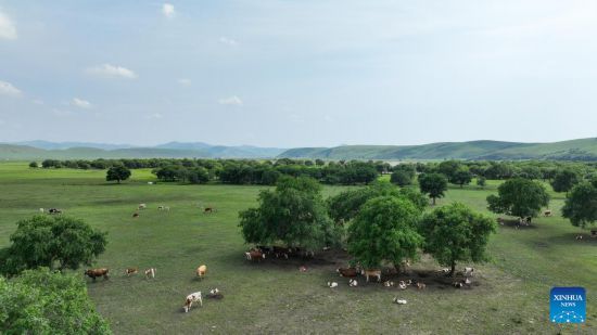 An aerial drone photo taken on July 4, 2025 shows the scenery of the Wulanmaodu pasture in Horqin Right Wing Front Banner, Hinggan League, north China's Inner Mongolia Autonomous Region. In the first half of this year, the banner recorded 2.55 million tourist trips, with total tourism expenditure reaching 882 million yuan (about 123.12 million U.S. dollars). (Xinhua/Bei He)