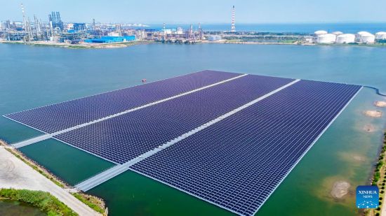 An aerial drone photo taken on July 4, 2025 shows a floating offshore photovoltaic (PV) project of Sinopec Qingdao Refining &Chemical Co., Ltd. in a full-seawater environment in Qingdao, east China's Shandong Province. The project was connected to the grid for electricity generation recently. Located in the Xihai'an (West Coast) New Area of the east China's coastal city, the project innovatively adopts a floating structure, with the photovoltaic panels rising and falling close to the water surface with the tide, and uses seawater to efficiently dissipate heat to improve power generation efficiency. With an installed capacity of 7.5 megawatts, it is expected to generate nearly 10 million kilowatt-hours of green electricity annually and reduce carbon dioxide emissions by 8,300 tons. Since it was put into use on July 1, the project has generated a total of 123,100 kilowatt-hours of electricity. (Photo by Zhang Jingang/Xinhua)