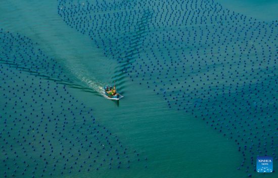 An aerial drone photo taken on July 3, 2025 shows a marine ranch in Lianjiang County of Fuzhou, southeast China's Fujian Province. Leveraging its unique marine resources, distinctive fisheries industry, and regional economic advantages, Lianjiang County has in recent years been promoting the upgrade and intelligent transformation of deep-sea and far-sea mariculture platforms, and developing the farming of aquatic products such as kelp, large yellow croaker, and abalone.