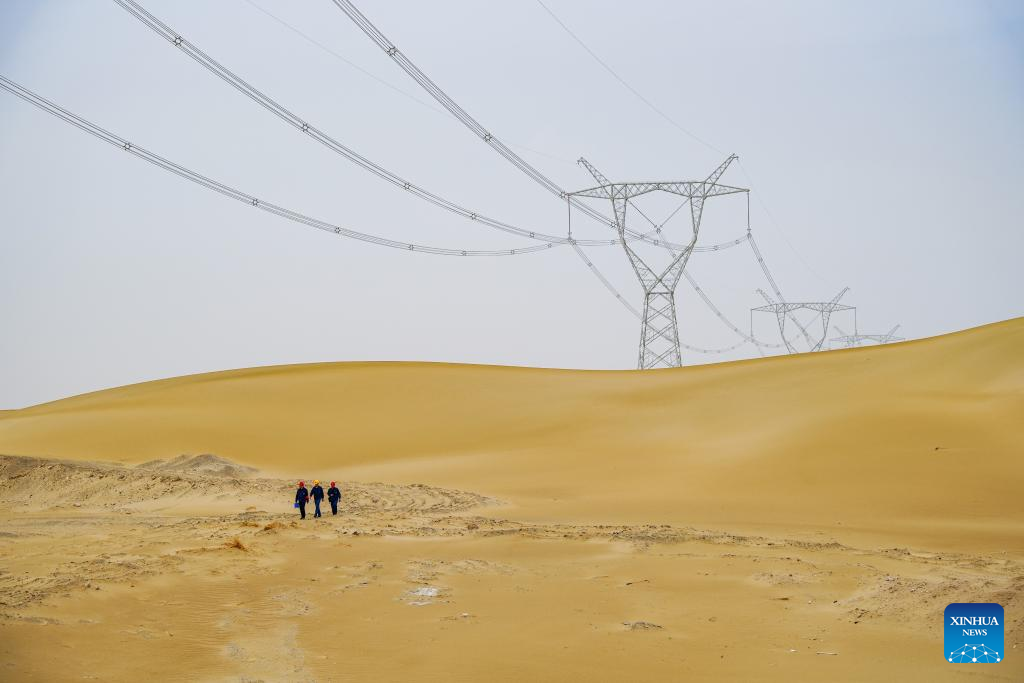 Staff members patrol along the power lines of the 750 kV grid around the Tarim Basin in Yuli County, northwest China's Xinjiang Uygur Autonomous Region, April 27, 2024. (Xinhua/Xu Hongyan)