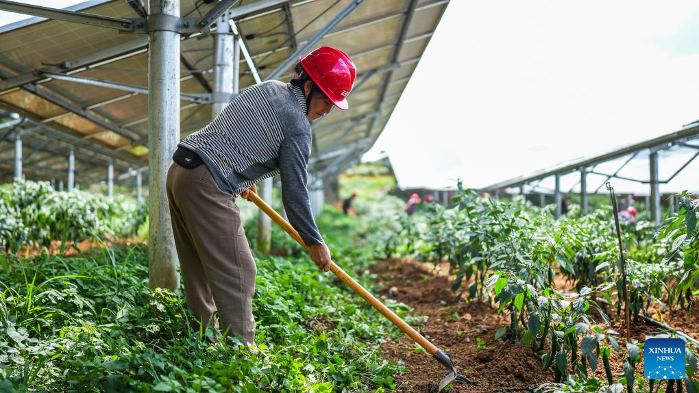 A farmer grows peppers under photovoltaic panels in Xinqiao Town of Anlong County, southwest China's Guizhou Province, July 5, 2023. In recent years, Guizhou has made significant progress in ecological construction, striving to transform ecological advantages into developmental strengths.