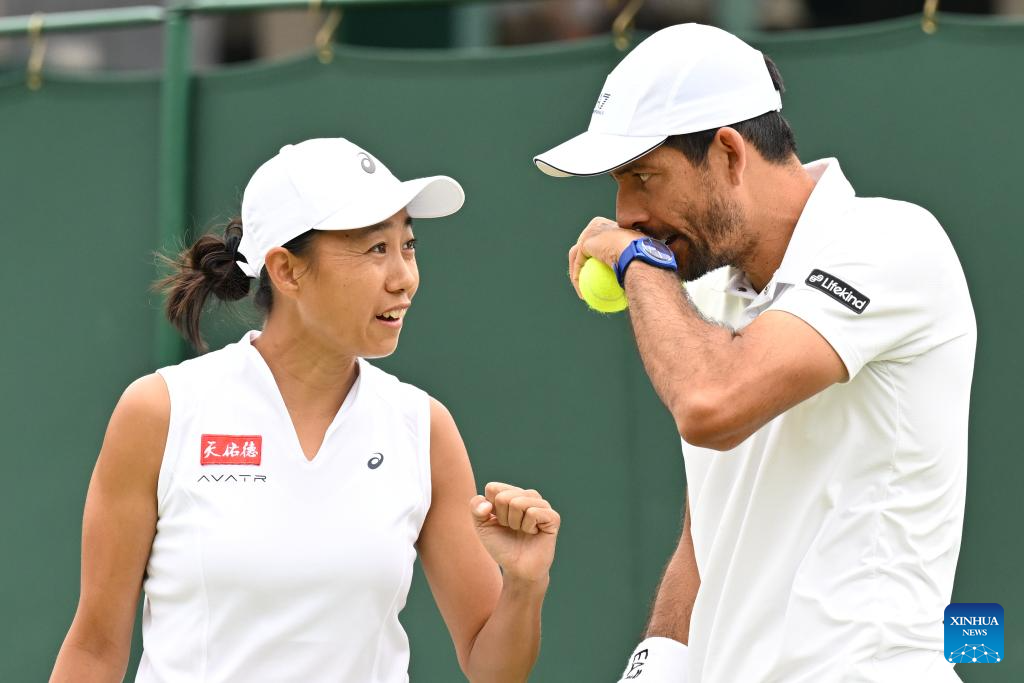 Zhang Shuai (L)/Marcelo Arevalo compete during the mixed doubles first round match between Zhang Shuai of China/Marcelo Arevalo of El Salvador and Chan Hao-Ching of Chinese Taipei/Andre Goransson of Sweden at the Wimbledon Tennis Championships in London, Britain, July 5, 2025. (Xinhua/Zhao Dingzhe)
