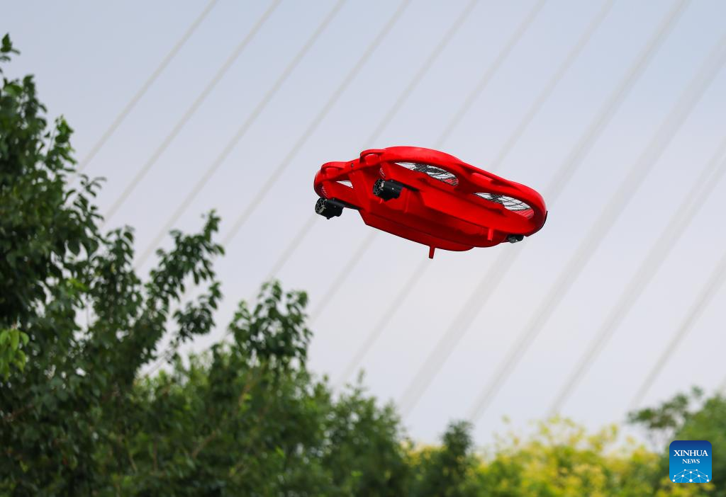 A rescue drone is seen during a flood rescue drill on Haihe River in north China's Tianjin, on July 5, 2025. The drill was set against potential flooding in culverts and low-lying urban areas affected by heavy rainfall. (Xinhua/Sun Fanyue)