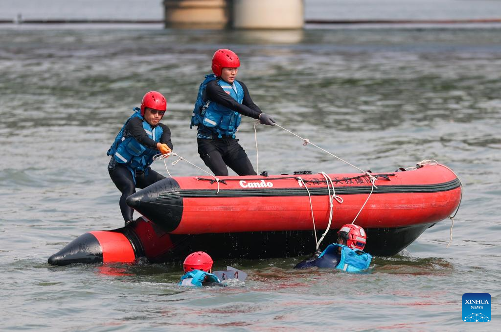 Rescuers participate in a flood rescue drill on Haihe River in north China's Tianjin, on July 5, 2025. The drill was set against potential flooding in culverts and low-lying urban areas affected by heavy rainfall. (Xinhua/Sun Fanyue)