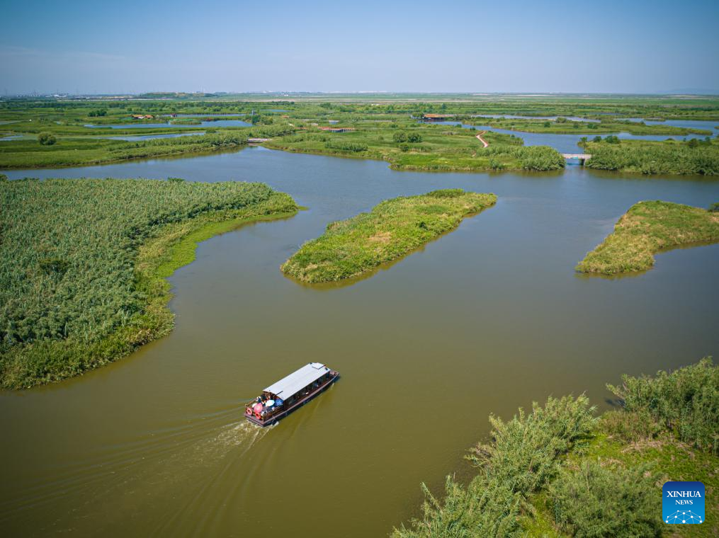 An aerial drone photo taken on July 5, 2025 shows tourists taking boat to watch birds at Hangzhou Bay National Wetland Park in Ningbo, east China's Zhejiang Province, July 5, 2025.