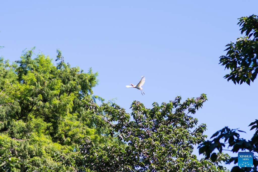 A white egret soars over Hangzhou Bay National Wetland Park in Ningbo, east China's Zhejiang Province, July 5, 2025.