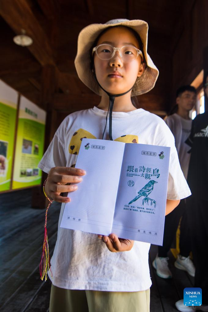 A young visitor shows a stamp collected during a birdwatching activity at Hangzhou Bay National Wetland Park in Ningbo, east China's Zhejiang Province, July 5, 2025.