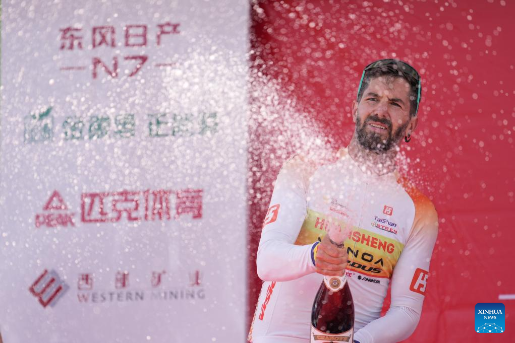 Second placed Eduard-Michael Grosu of Huansheng-Vonoa-Taishan Sport Team celebrates on the podium after Stage 1 of the Tour of Magnificent Qinghai international road cycling race in Xining, northwest China's Qinghai Province, July 6, 2025. (Xinhua/Qi Zhiyue)