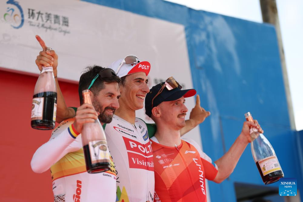 First placed Manuel Penalver Aniorte (C) of Team Polti Visitmalta, second placed Eduard-Michael Grosu (L) of Huansheng-Vonoa-Taishan Sport Team and third placed Alexander Salby of Li Ning Star celebrate on the podium after Stage 1 of the Tour of Magnificent Qinghai international road cycling race in Xining, northwest China's Qinghai Province, July 6, 2025. (Xinhua/Zhang Long)