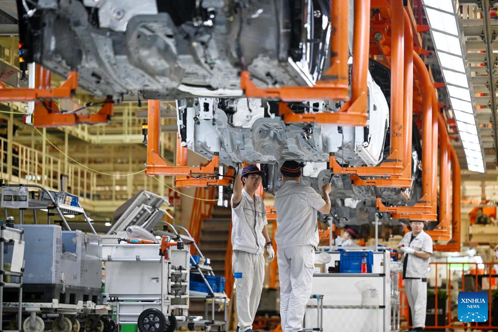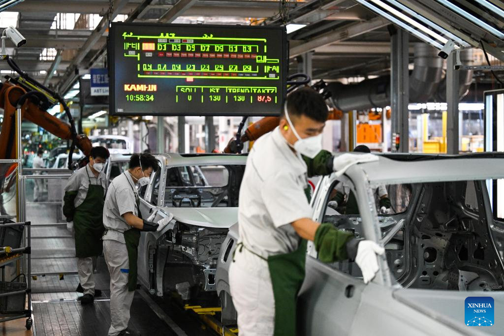 Staff members operate at an assembly line of the north China base of FAW-Volkswagen in north China's Tianjin, July 7, 2025. In recent years, Tianjin has been committed to building smart factories and accelerating the deep integration of the digital economy with the real economy. As of now, the city has established a total of 400 smart factories and digital workshops, continuously promoting the digital transformation of its manufacturing sector. (Xinhua/Zhao Zishuo)