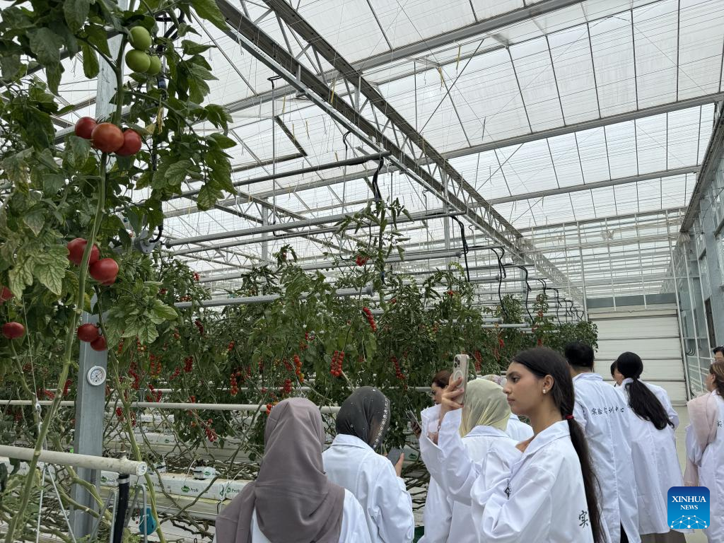 Students from Pakistan's southwest Balochistan province visit a greenhouse in which tomatoes are grown using soilless cultivation at Beijing Vocational College of Agriculture in Beijing, capital of China, July 3, 2025. (Beijing Vocational College of Agriculture/Handout via Xinhua)
