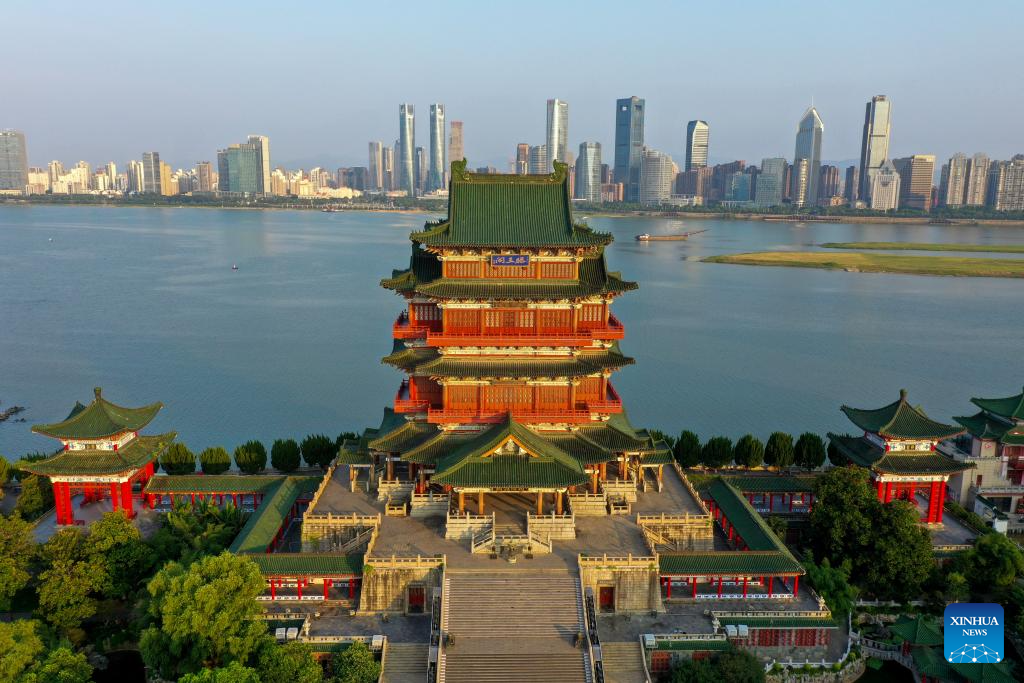 An aerial drone photo taken on July 7, 2025 shows a view of the Tengwang Pavilion scenic area in the morning light in Nanchang City, east China's Jiangxi Province. The Tengwang Pavilion, the 29th iteration in its 1,400-year history, features intricately carved beams and vibrantly painted rafters. It stands majestically along the banks of the Ganjiang River, which winds through eastern China's Jiangxi Province. About 90 percent of the scenic area has been open to the public for free as of Jan. 1 this year when a northward expansion project was fully completed. (Xinhua/Liu Jinhai)