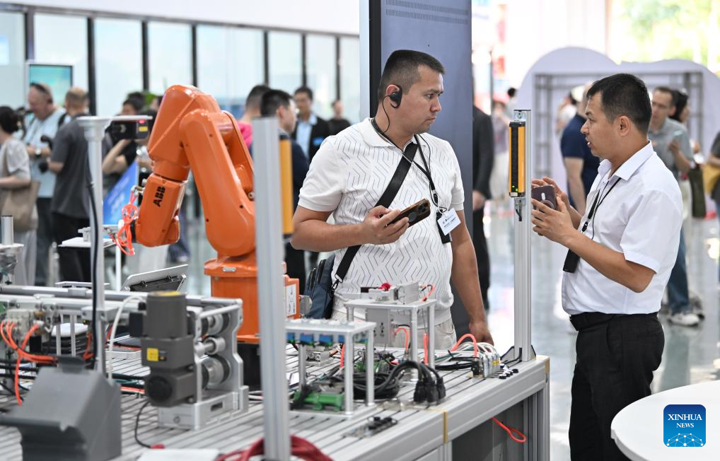 Guests communicate at Tianjin Light Industry Vocational Technical College in north China's Tianjin, July 7, 2025. Guests gathered in Tianjin for the Global Mayors Dialogue -- SCO Summit Cities and visited the smart zero-carbon terminal of Tianjin Port, Luban Workshop Construction and Experience Museum and other places to learn about China's economic and social development. (Xinhua/Li Ran)